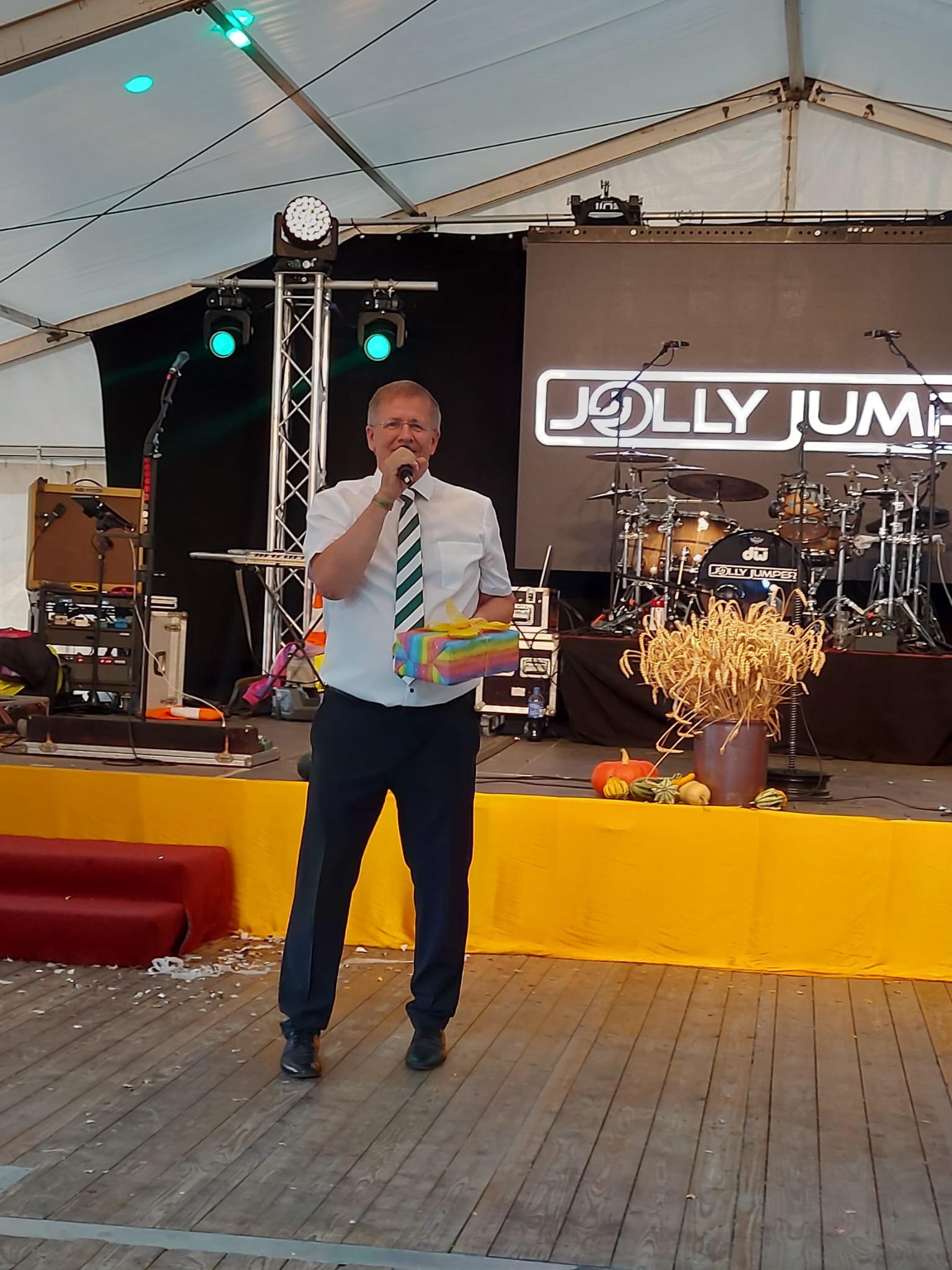 Viel Zeit zum Verschnaufen blieb nicht, da ab 19:00 Uhr das Warm- up mit Robert Drechsler begann, der auf Bitten der Mitglieder des Heimatvereins unseren Vorsitzenden ehrte und ein Geschenk für seine Hingabe, mit der er den Verein seit 25 Jahren leitet, überreichte. Vielen Dank Frank Ortmann!