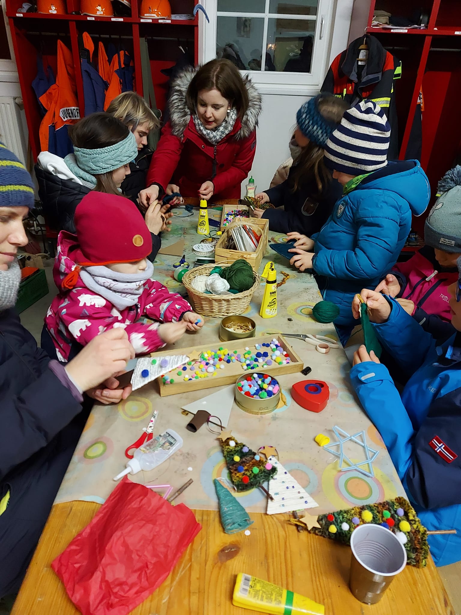 In der Feuerwehr bastelten Mandy und Sarah mit den Kindern Sterne und Weihnachtsbäumchen. Familie Friedrich hatte Holzbastelsets, die zu Eulen oder Engeln zusammengefügt werden können, zum Erwerb vorbereitet.